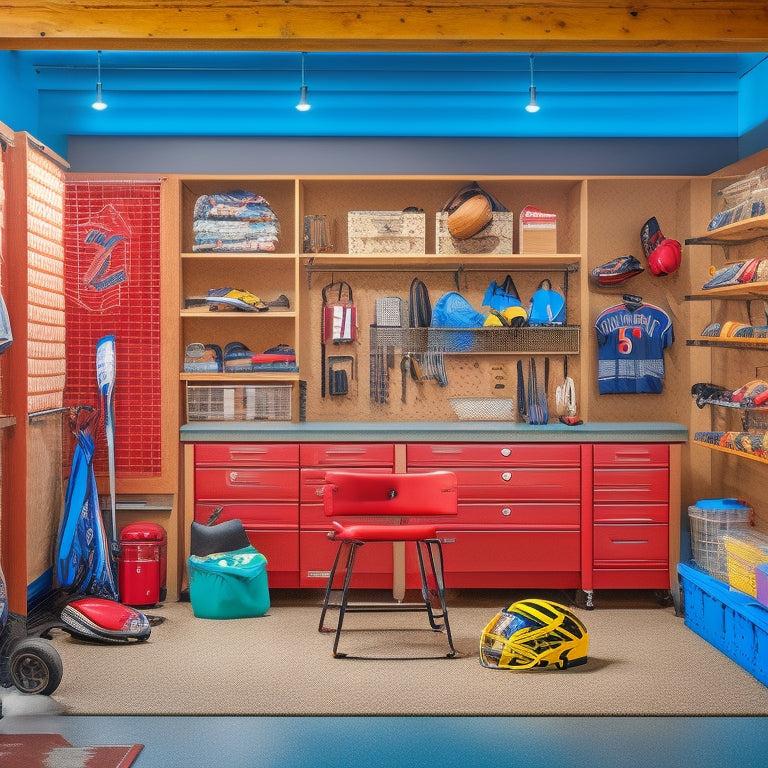 You're about to transform your cluttered garage into a sports enthusiast's paradise, optimized for efficient storage and quick access to your favorite gear. Start by utilizing ceiling storage racks to reclaim floor space and hold up to 75% of your sporting equipment. Install a sports equipment pegboard station for customizable storage and easy access. Labelled bins will provide quick access to your gear, while sliding shelves and wall-mounted bike racks will keep your floors clear. Modular cabinet systems, overhead storage, and ball return systems will streamline your storage. By implementing zone-based garage organization, you'll be able to find what you need in no time - and discover even more ways to maximize your garage's potential.