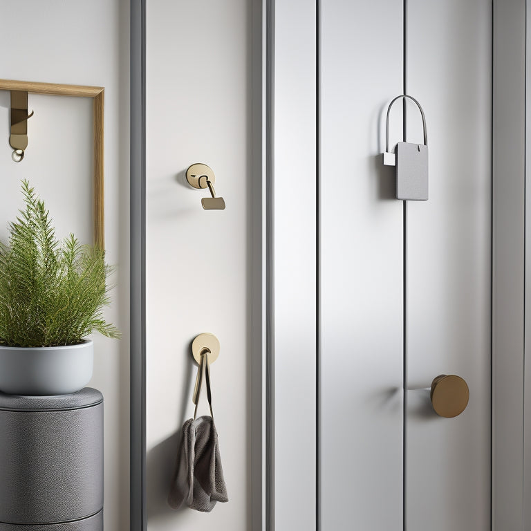 You're ready to optimize your small space with clever key storage hacks. Start by utilizing vertical wall space with shelves, hooks, or pegboards. Repurpose everyday items like magnetic spice tins or old CD cases as functional key holders. Designate key zones with compact key racks or adhesive key strips. Hang keys on hooks to free up space and add visual appeal. Consider over-the-door storage or hidden compartments for added convenience. By implementing these hacks, you'll save space, reduce clutter, and enjoy easy key access. Now, discover more innovative solutions to transform your entryway into a haven of efficiency.