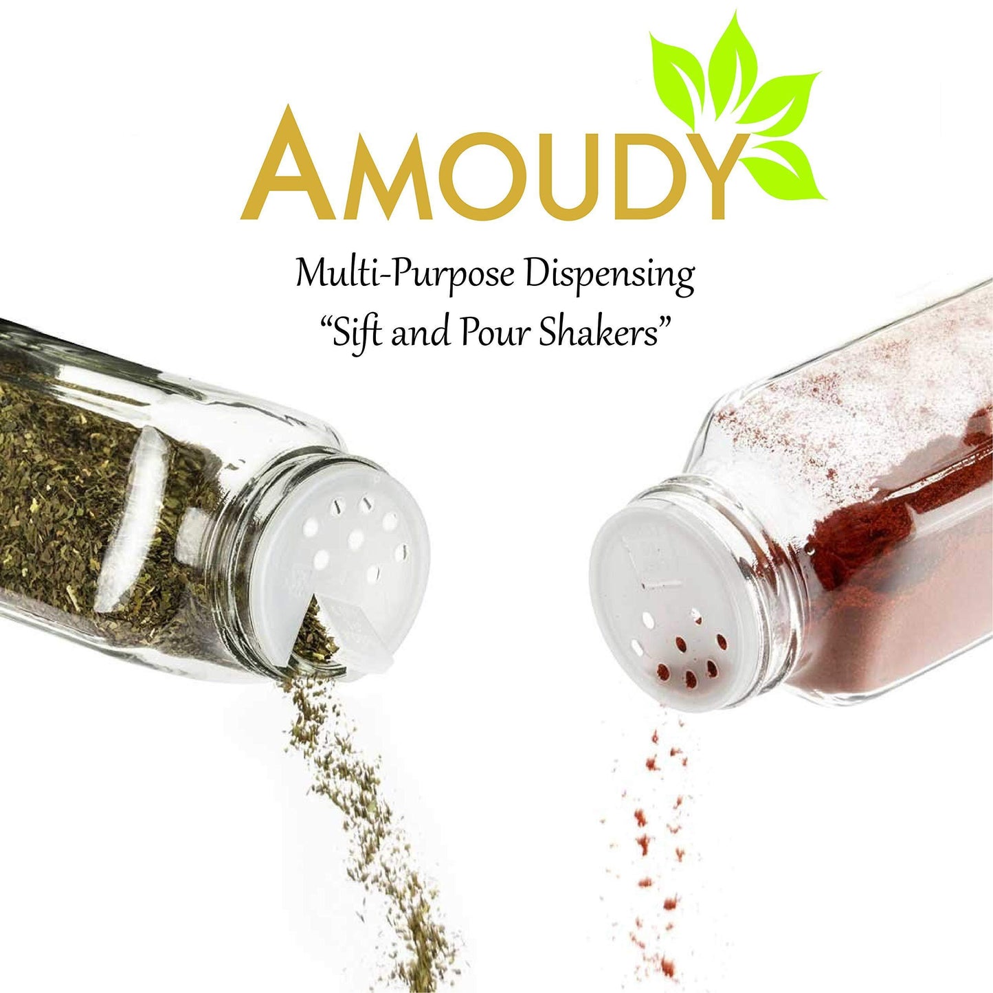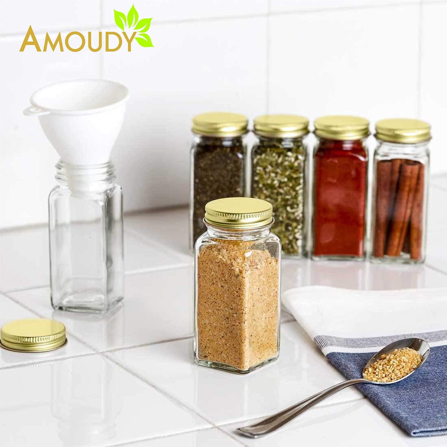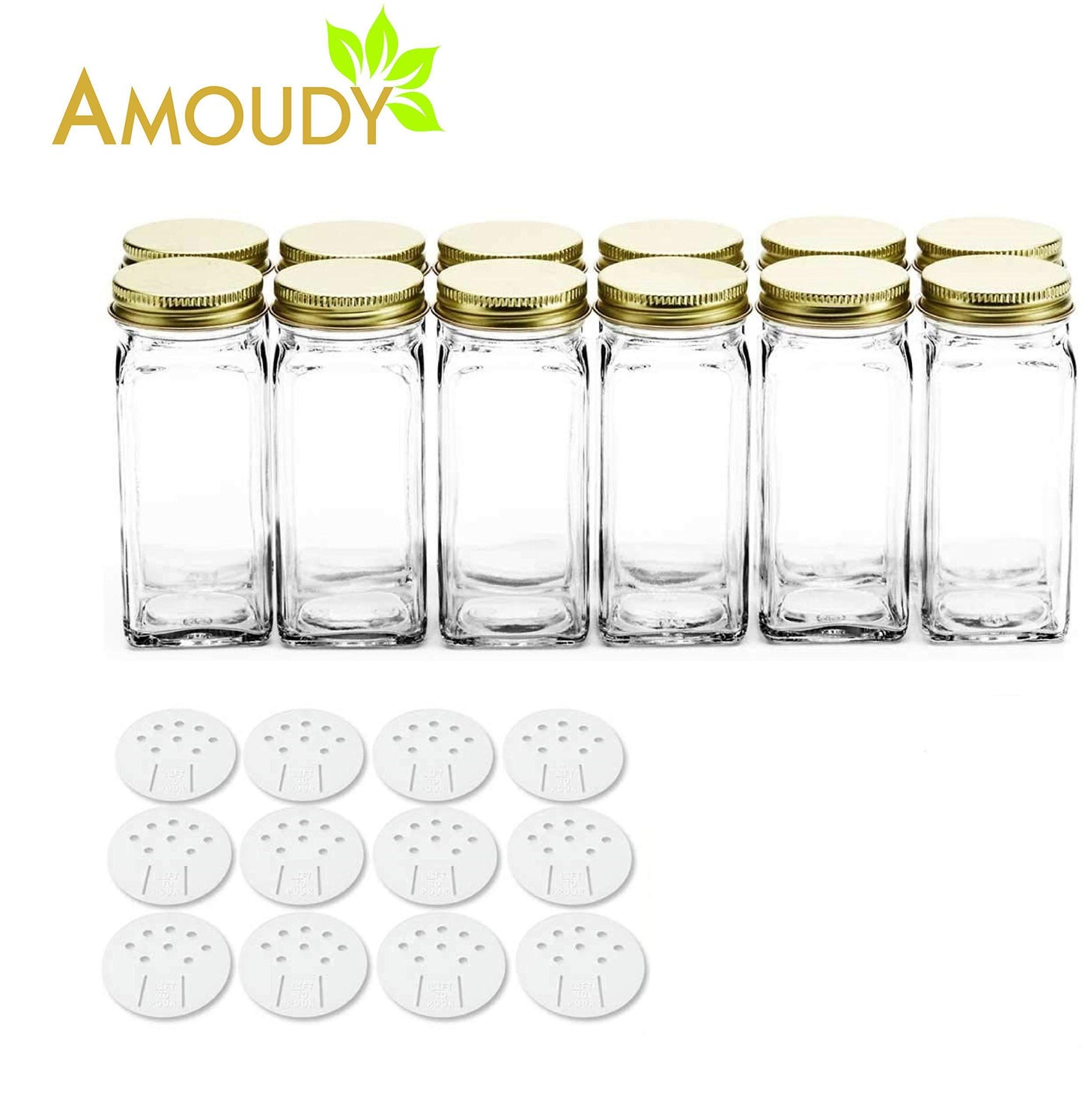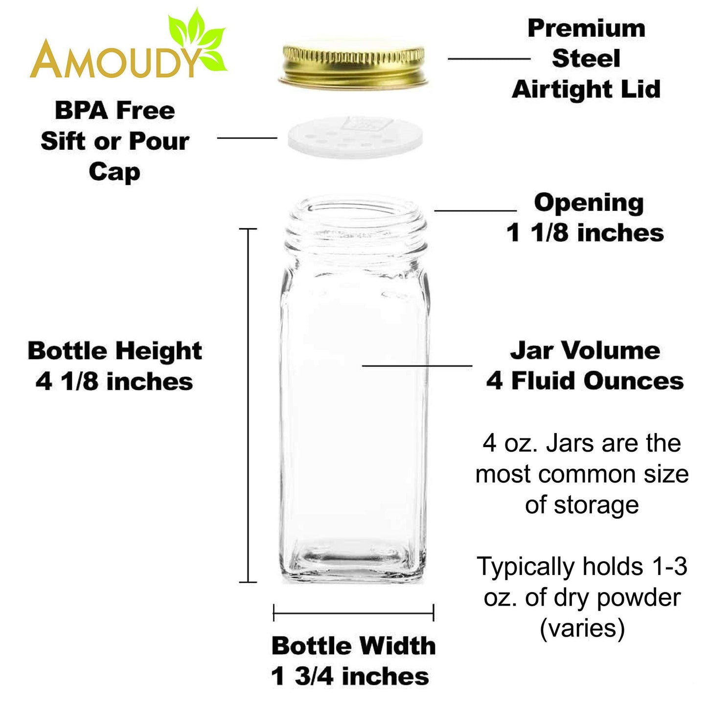 Details: Upgrade Your Spices with premium spice jars set by AMOUDY. Our jars have classic design - French/Flint style square glass bottles. The style is similar to the jars sold by Trader Joe's, Simply Organic, Whole Foods, AMOUDY, and many more top notch brands. Organize your spice drawer and enjoy the extra room on your kitchen counter or pantry. Especially useful for kitchens with limited space. The set includes free Snap-On BPA Free dispensing top shaker & pour with 8 holes .125 diameter each, which are ideal for seasonings, spices, herbs, powder, and confectionery products. The jars fit 4oz, same contents of most store-bought spice jars. WHAT YOU'LL RECEIVE with AMOUDY's JAR SET: 12 premium glass jars, 12 airtight metal caps, and 12 sift & pour shaker cap. THE SET DETAILS: French Square Design Jars, 4" x 1 3/4" with a 1 1/4" opening, 4 fl oz bottles hold 1-3 oz by weight depending on spice. Quality metal caps for an airtight seal exclusive sift and pour, snap-on, BPA free shakers. COMMITMENT: We are committed to making sure that you leave this transaction satisfied. That means having access to real people that get your questions and concerns answered in less than 24 hours. Give us a shot and we will make sure that you will look for us again.