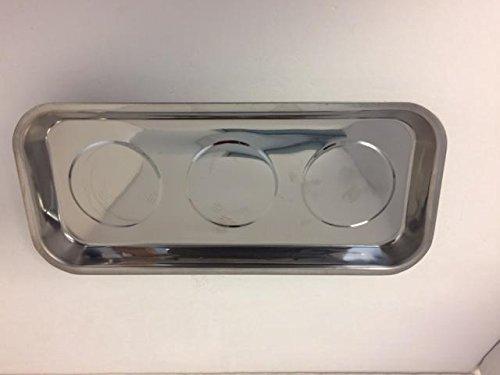 Details: 14" x 6" Parts Tray * ~7/8" depth. * Stainless steel tray. * 3 Very strong magnetic bases w/ rubber boot covering. * Can be used at any angle due to magnetic base. * Great for metal bolts, hardware, small tools...... KEEP THEM WHERE YOU WANT THEM! * Super for the garage, job site, hobbies.... (Pictured hardware in the stainless steel 14" x 6" parts tray doesn't come with the product.)