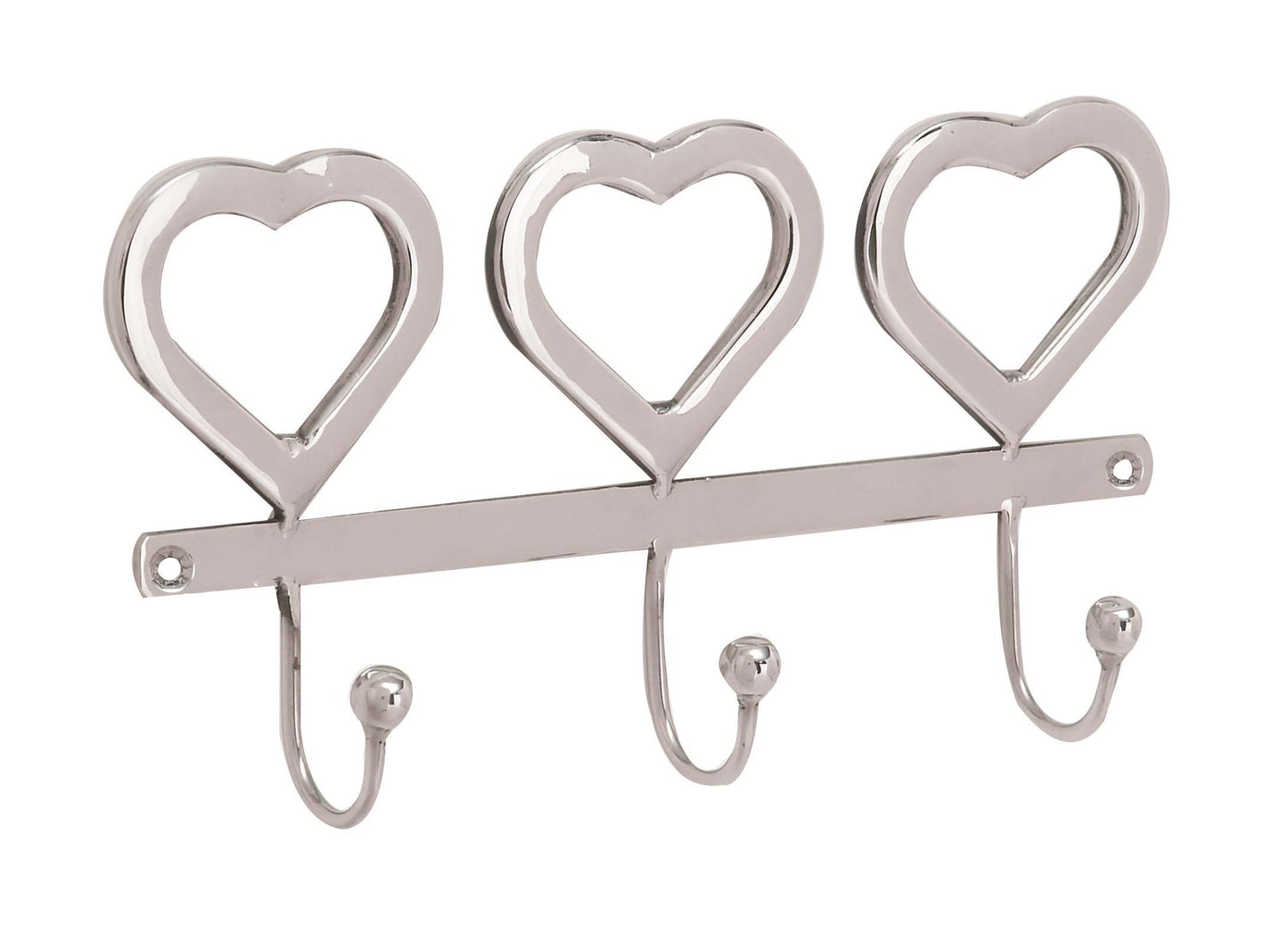 Details: 10" x 5" Modern Reflections stainless steel heart wall hook, silver-finished stainless steel wall hook, features three heart-shaped accents, three stainless steel hooks