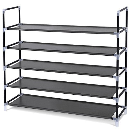 5-Tier shoe rack organizer storage bench stand for mens womens shoes closet with unwoven fabric shelves & holds 25 pairs.Hot black shoe racks with unwoven fabric shelf & easy assembly no tools