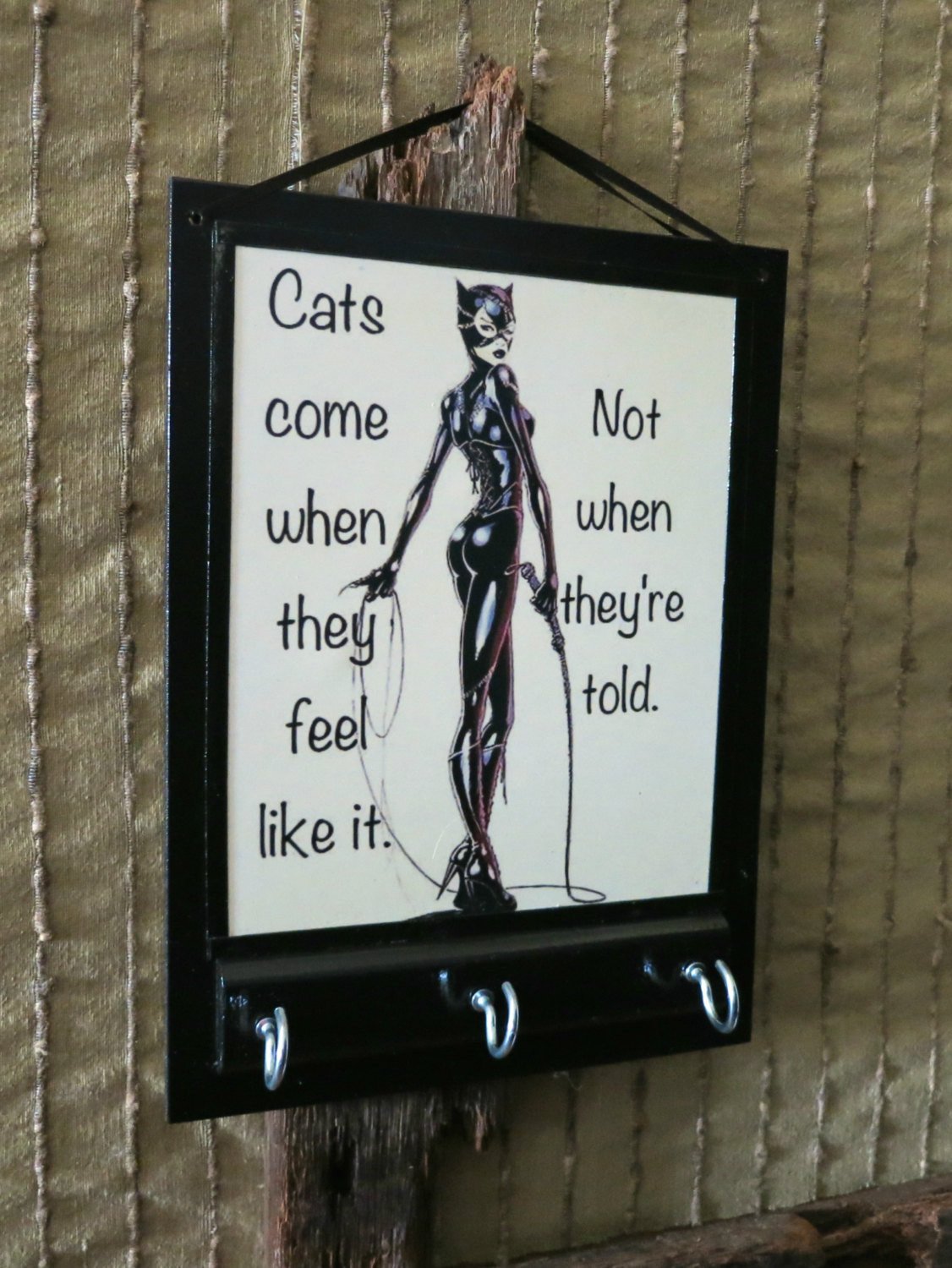 Key holder has a Cat Woman print attached to a MDF board which is highly glazed with 3 coats of clear lacquer to stop any fading of the photo.