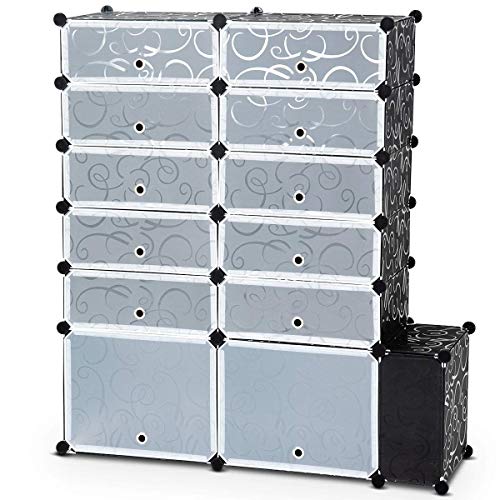 Stylish design:This shoe rack has 13 cubes and totally 6-tire and it can be flexible assembled.In the meanwhile it features black body and white embossed door, so it can fit rooms from entryway, closet, mudroom or bedroom.