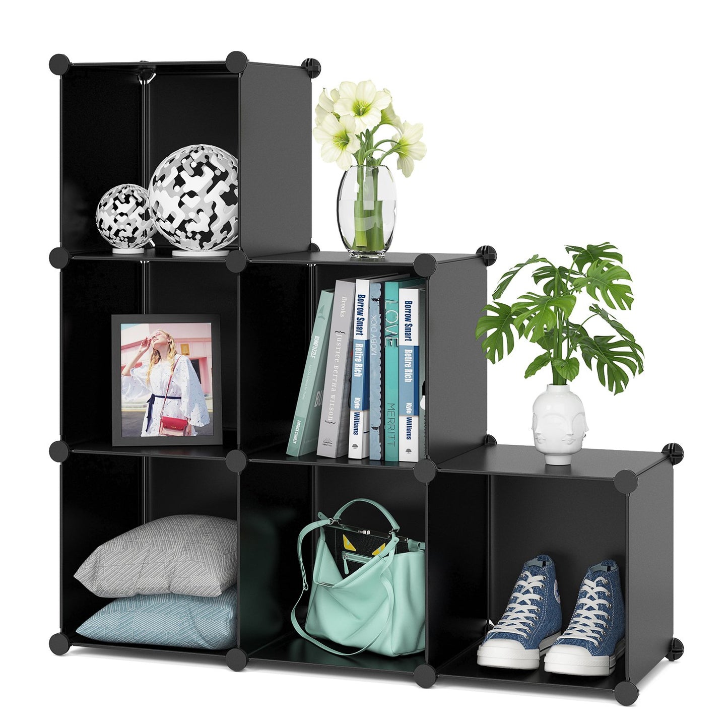 Homfa Cube Storage Organizer, 6 Cubes Shoe Rack, DIY Plastic Modular Closet Cabinet Storage Organizer, Living Room Office Bookcases Shelves for Books, Cloths, Toys, Shoes, Arts, Black