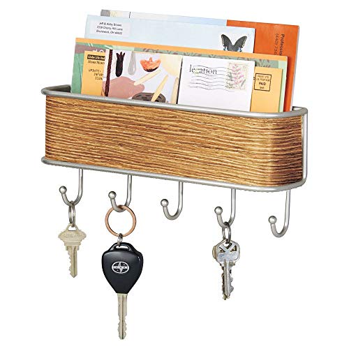 This handy helper will corral your mail, newspapers, letters, keys, coats, jackets, and other outdoor accessories in one convenient place with the Mail Holder and Key Rack from mDesign. Hooks eliminate searching for lost keys, lanyards, purses and bags - just hang on the hook when you walk in the door! Place the holder on entryway, kitchen, or hallway walls with the included hardware for instant organization. The wood veneer finish on the front adds a nice decorative touch.