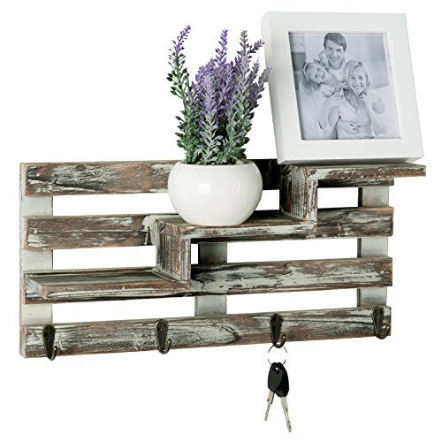 MyGift Rustic Torched Wood Wall Mounted Entryway Organizer Display Shelf Rack with 4 Key Hooks