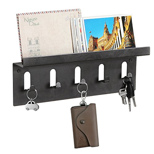 MyGift Wall Mounted Black Metal Mail Holder Shelf w/ 5 Key Hooks, Organizer Storage Rack