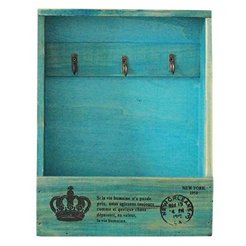 Olpchee Retro Wooden Wall Mounted & Tabletop Key Holder Rack Organizer Letter Mail Holder with 3 Key Hooks for Entryway Kitchen Office (Blue)