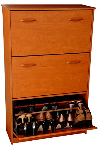 Keep your favorite footwear beautifully organized in this sleek triple tier shoe cabinet with cherry finish. Up to 36 pairs of shoes are cleverly concealed behind three drop-down doors, yet easily accessible - each drop door opens in one smooth motion, so you can quickly view and select the pair you want. Helps you accessorize your outfits while keeping your closet floor free of shoe clutter. This stylish shoe storage system is also attractive enough to be used as a bedroom or entryway furnishing. Constructed of durable, easy-to-clean melamine. These units have back panels for added structural stability. The back panels are not for decorative purpose as they are not visible behind the shoe racks. The open area is left to provide ventilation. Organize your entire collection in this tall shoe organizer. Designed for women's shoes and men's shoes up to size 12. Dimensions: 48"H x 30"W x 11 1/2"D. Assembly required. Made in the USA. Assembly level/degree of difficulty: Moderate. Made in America