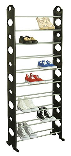 Ten tiered Black shoe rack can hold up to thirty pairs of shoes. Thin design to maximize closet space, sturdy stackable plastic sides, metal rods to prevent shoes from slipping and an easy to assemble formation.