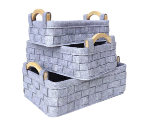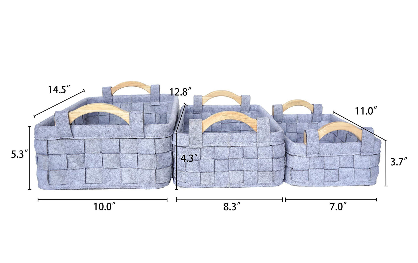 - SET OF THREE: 3 Multi-Size Rectangular Woven Felt Storage Basket. Each Basket Comes with Built-in Wooden Handles on Both Sides Making It Easy to Transport.