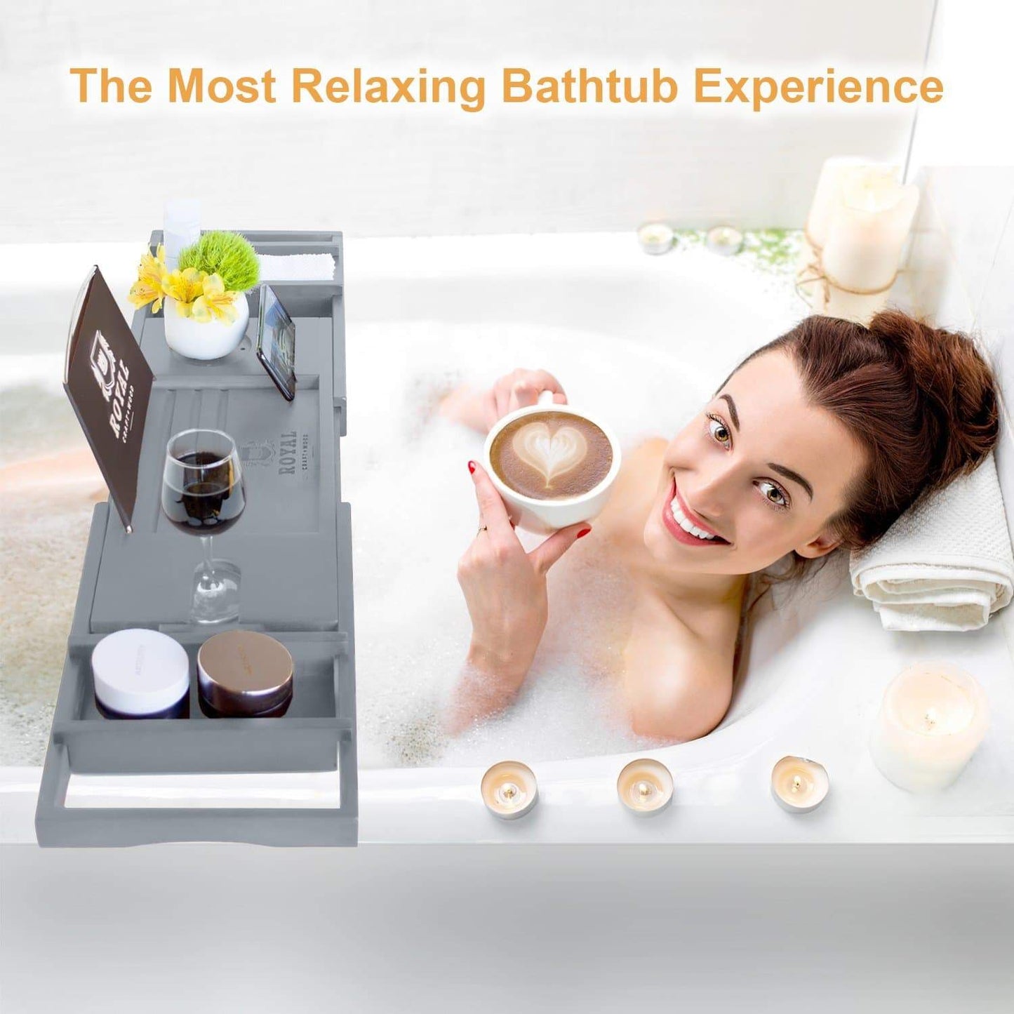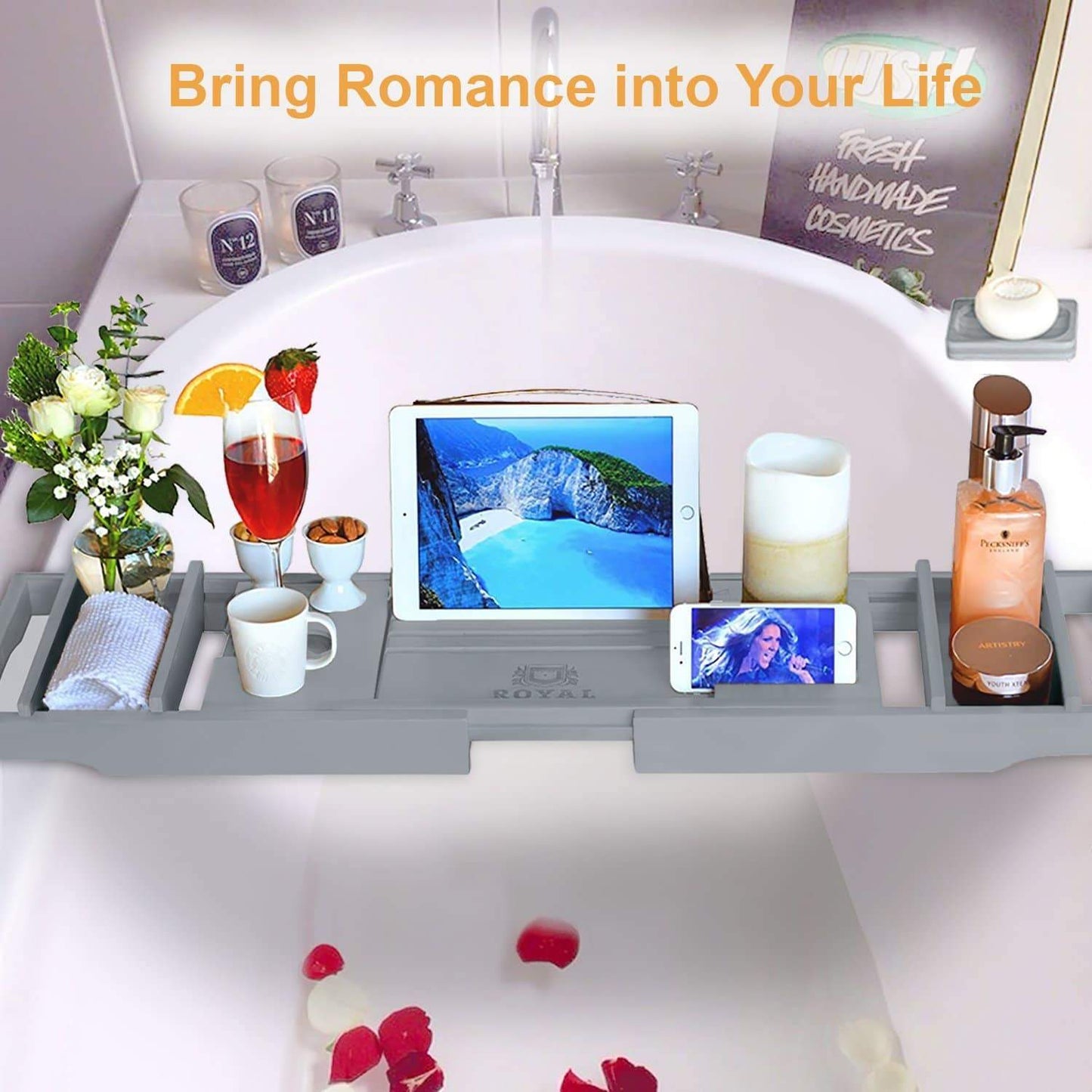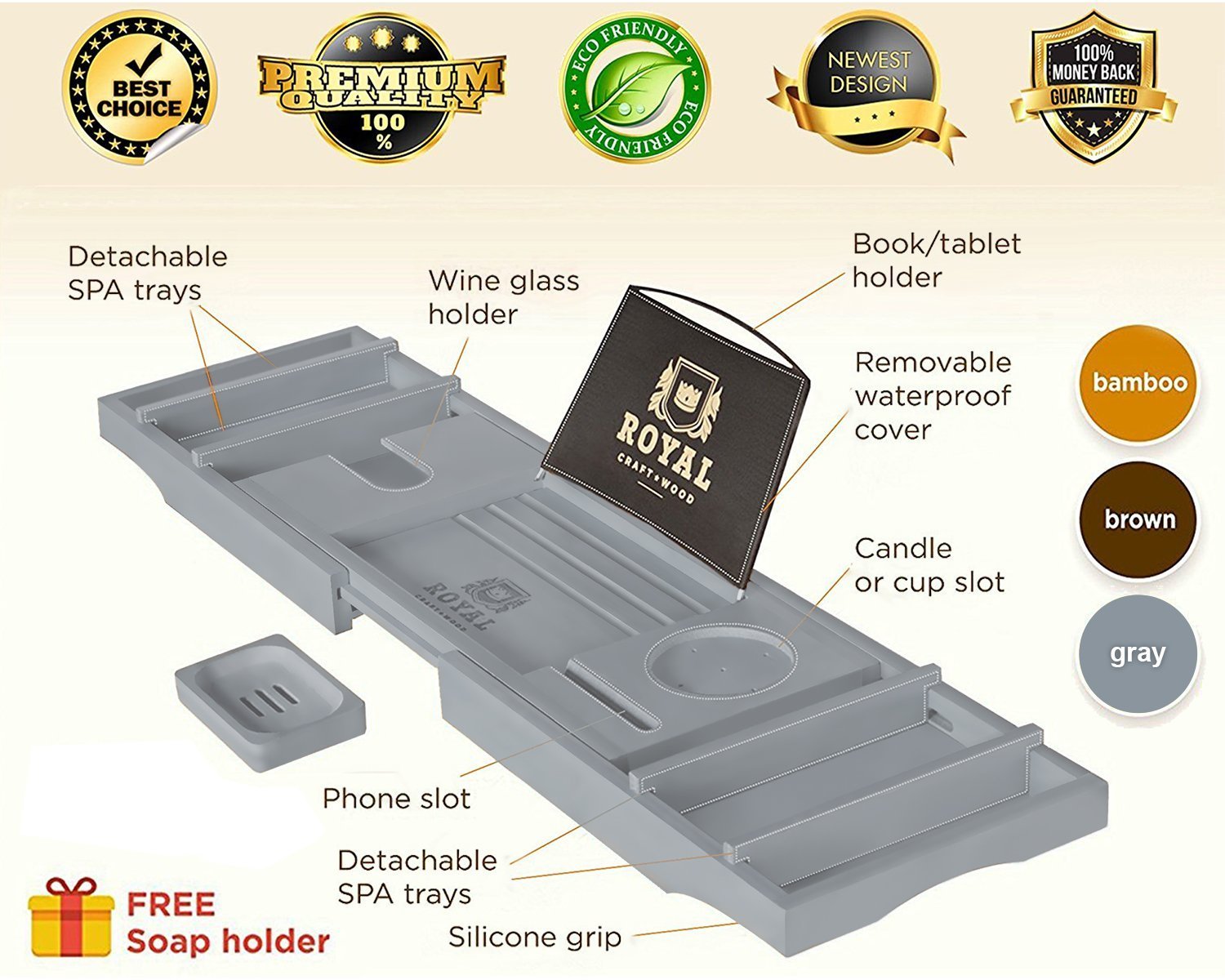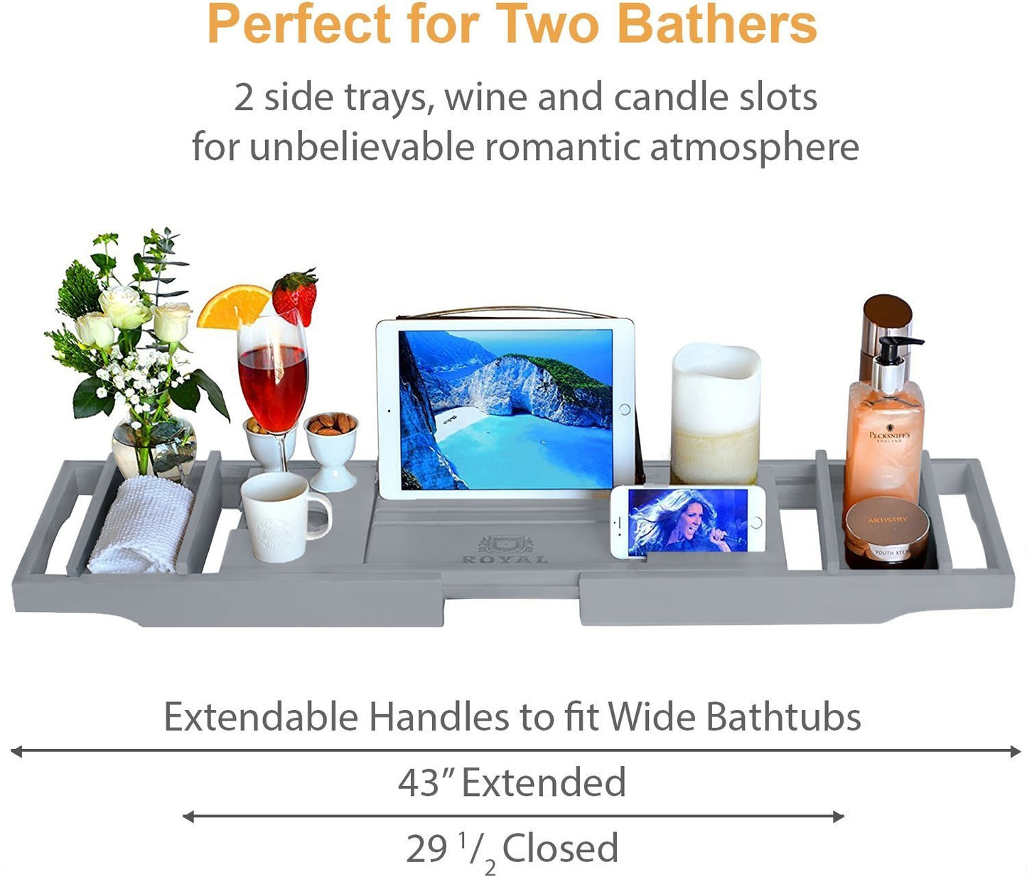 Royal Craft Wood Luxury Bamboo Bathtub Caddy Tray with Book and Wine Holder - One or Two Person Bath and Bed Tray with Extending Sides - Free Soap Dish - (Gray)