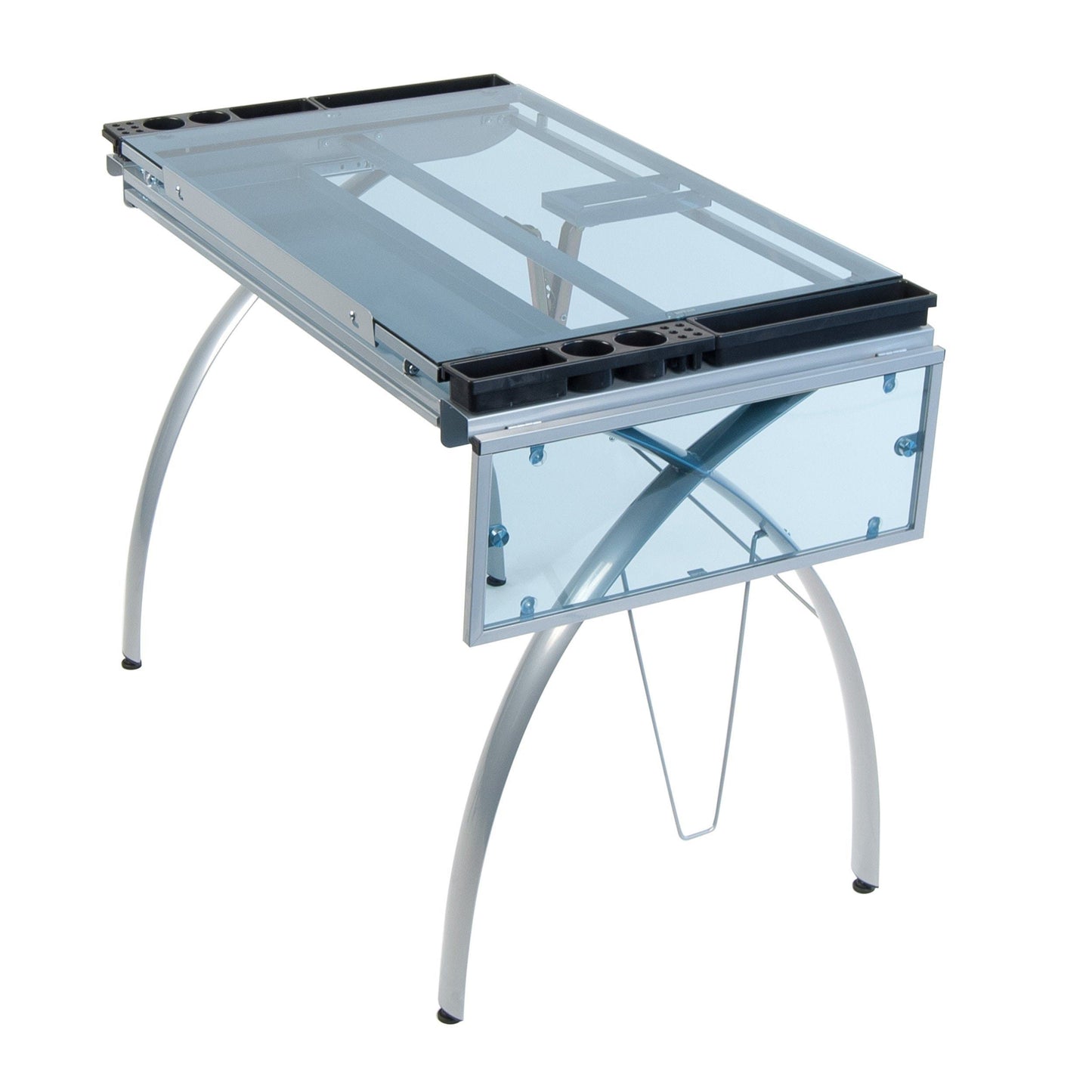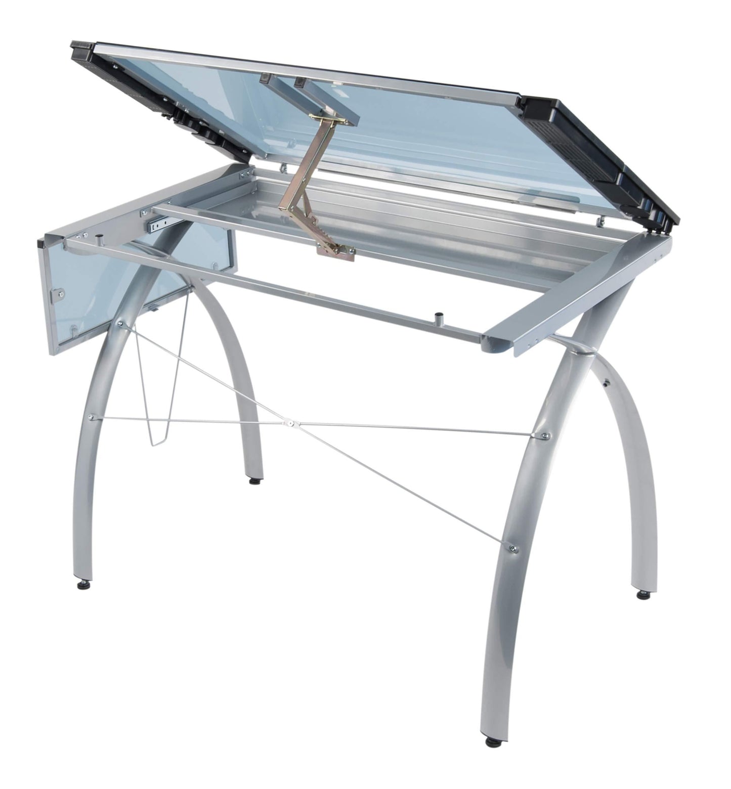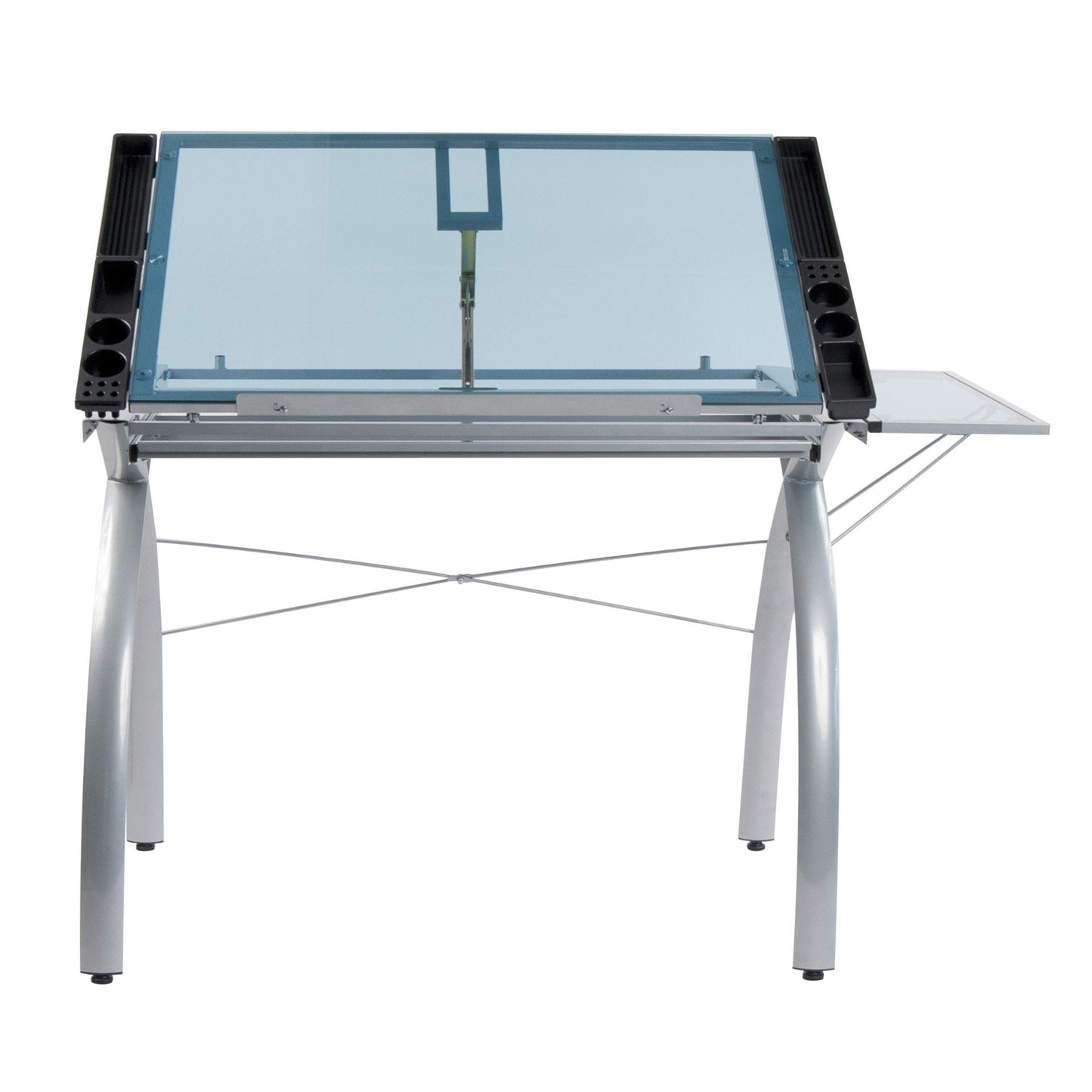 Details: The perfect multi-functional contemporary table: Studio Designs' Futura Craft Station with its adjustable work desk and folding shelf is great for drafting, drawing, or crafting on its large tempered safety-glass work surface. Its main work surface consists of a 35.5"W X 23.75"D glass.