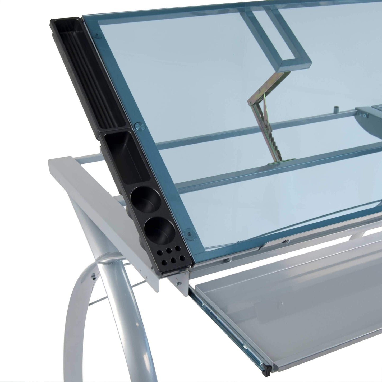 SD STUDIO DESIGNS Futura Craft Station w/ Folding Shelf, Top Adjustable Drafting Table Craft Table Drawing Desk Hobby Table Writing Desk Studio Desk w/ Drawers, 35.5''W x 23.75''D, Silver/Blue Glass