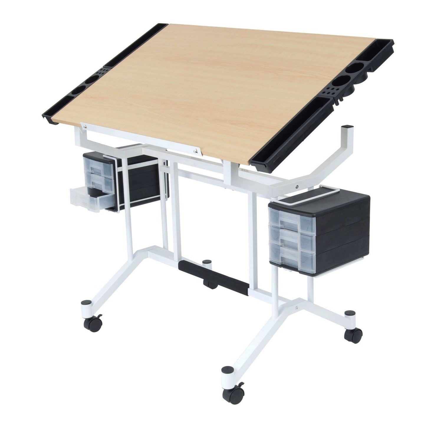 Details: The Pro Craft Station by Studio Designs provides ample work space and stores all of your supplies and accessories. The table top adjusts up to 45 degrees. 4 removable side trays and 2 three-drawer storage shelves with adjustable height keep your supplies organized and accessible. A 24'' pencil ledge slides up and locks into place when needed. Also featured are a padded footrest and four wheel casters, two of which lock for secure mobility. Main work surface: 38''W x 24''D. Overall dimensions: 45''W x 24''D x 30.5" - 46''H.